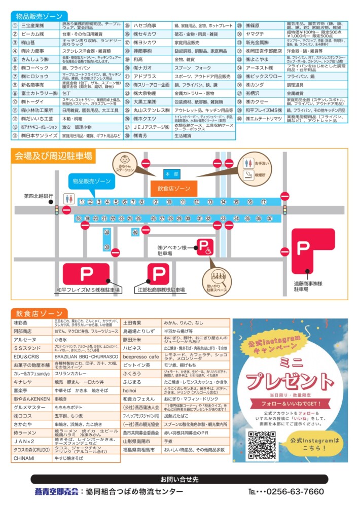 会場は燕市物流センター内で、開催時間は8:00〜15:00(雨天決行、荒天中止)です。