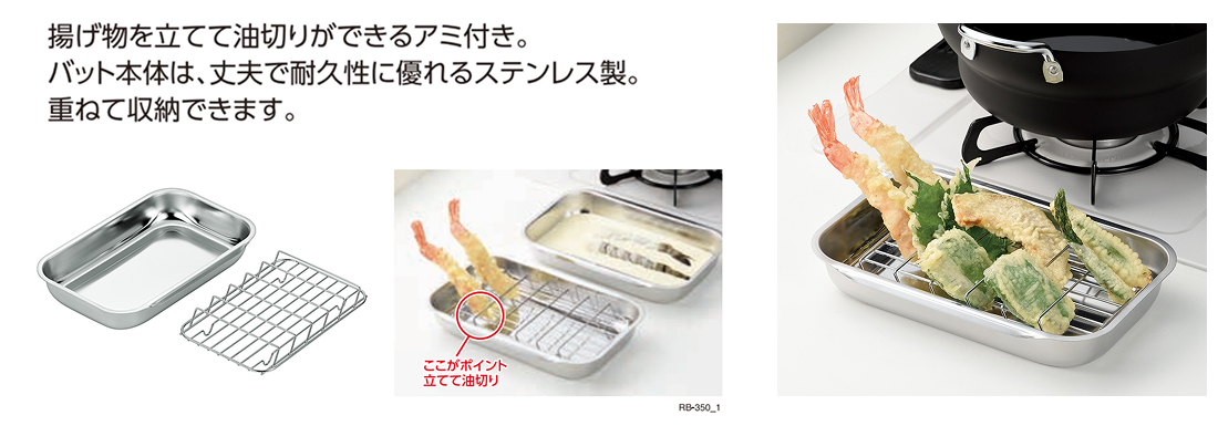 揚げ物の下ごしらえや、油きりに便利なバットセットです。