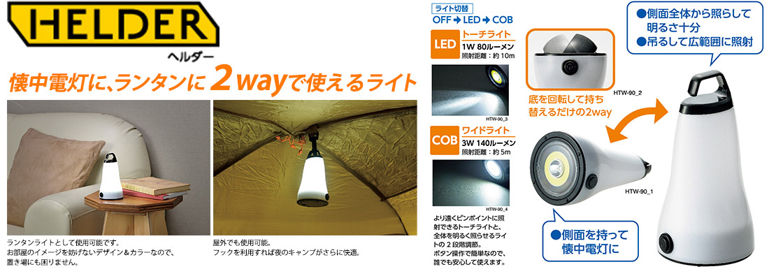 単四乾電池3本使用(別売) トーチライト(LED)1W 80ルーメン、ワイドライト(COB)3W140ルーメン 懐中電灯に、ランタンに・・・2WAYで使えるライト